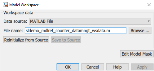 hWS = get_param('sldemo_mdlref_counter_datamngt', 'ModelWorkspace'); hWS.DataSource = 'MATLAB File'; hWS.FileName = 'sldemo_mdlref_counter_datamngt_wsdata.m'; hWS.reload;
