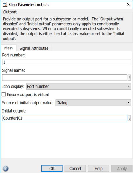 Корневой блок Outport использует начальную структуру условия (CounterICs), чтобы инициализировать систему выход до выполнения.