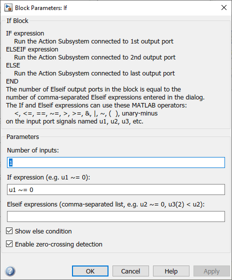 Блок 'If' использует LockedFlag предупредите, чтобы переключиться между 'Заблокированными' и 'Разблокированными' подсистемами. Дважды щелкните по блоку 'If' в модели, чтобы установить ее параметры (см. рисунок 2). LockedFlag представляет состояние муфты. LockedFlag = 1 если муфта заблокирована и LockedFlag = 0 если муфта разблокирована.