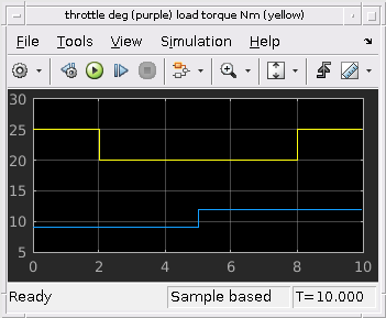 Попытайтесь настроить дроссель, чтобы компенсировать крутящий момент нагрузки. Рисунок 3 показывает симулированную скорость вращения двигателя, команды дросселя, которые управляют симуляцией и крутящим моментом нагрузки, который нарушает его.