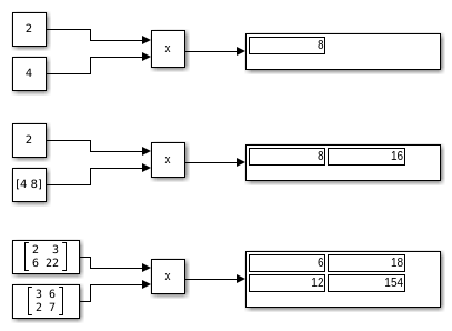 Блок Product имеет два режима: Поэлементный режим, который процессы нескалярные входные параметры поэлементно и режим Matrix, который процессы нескалярные входные параметры как матрицы.