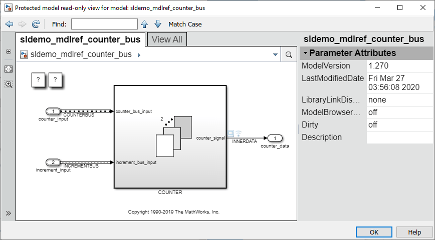 Модель в качестве примера содержит один блок Model под названием CounterA. Чтобы защитить модель, на которую ссылается этот блок, выберите блок Model и нажмите Protect на вкладке блока Model в панели инструментов. Диалоговое окно открывается, где можно выбрать опции для создания защищенной модели.