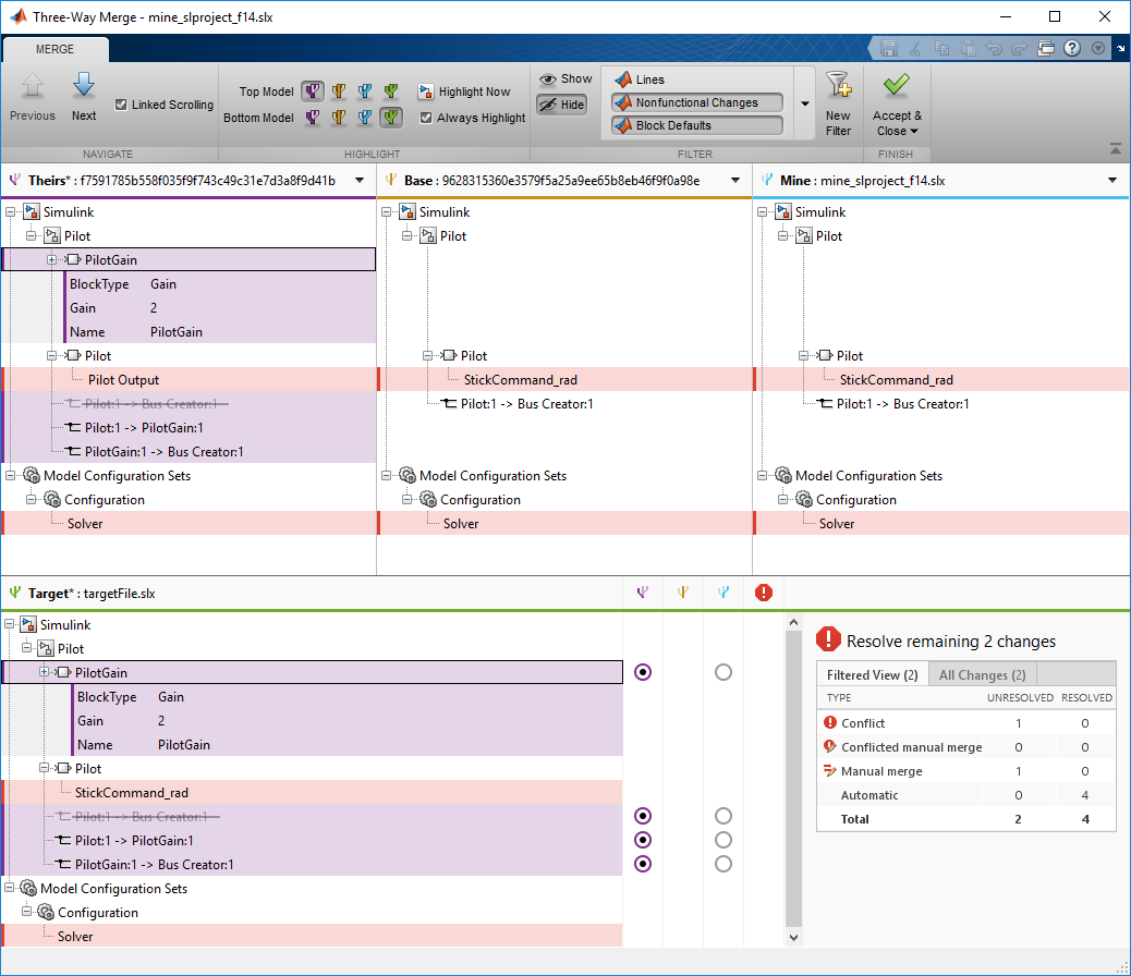 Включите MATLAB интегрирование Git™, чтобы автоматически объединить файлы модели.