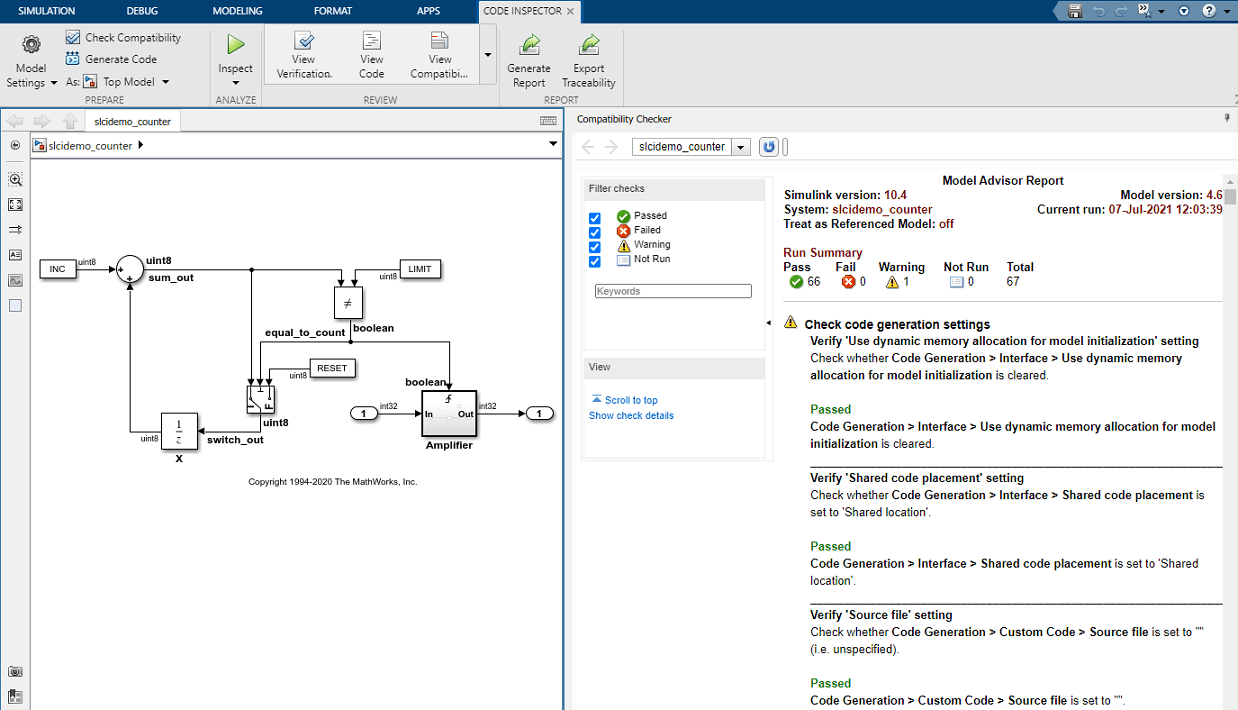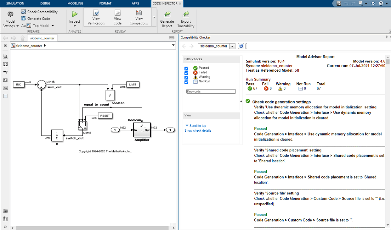 Можно использовать окно Model Advisor, чтобы выбрать и осуществить проверки совместимости Simulink Code Inspector подсистемы. Смотрите Осуществленные Проверки Model Advisor.