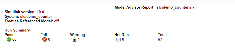 Результаты в диалоговом окне Model Advisor отображаются можно следующим образом: