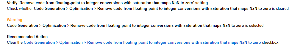 Программа контроля совместимости выдает предупреждение, потому что модель сконфигурирована, чтобы удалить код, который обрабатывает с плавающей точкой к целочисленным результатам преобразования для NaN значения при отображении от NaN к целочисленному нулю происходит. Эта настройка не поддерживается Simulink Code Inspector.