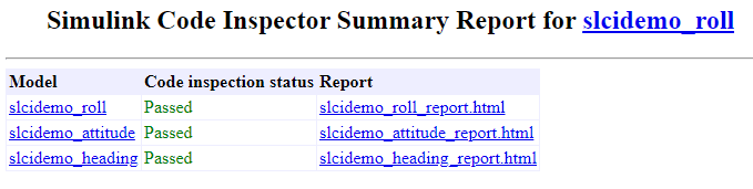 Чтобы сгенерировать акты осмотра кода HTML для иерархии модели, возвратитесь к окну топ-модели. Затем нажмите Generate Report. Simulink Code Inspector отображает сводный отчет HTML.