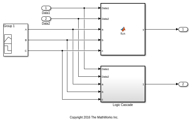 В блоке MATLAB function, если (&& (b | | c)) будет верно, то сигнал Data1 будет выведен; в противном случае сигнал Data2 выводится.