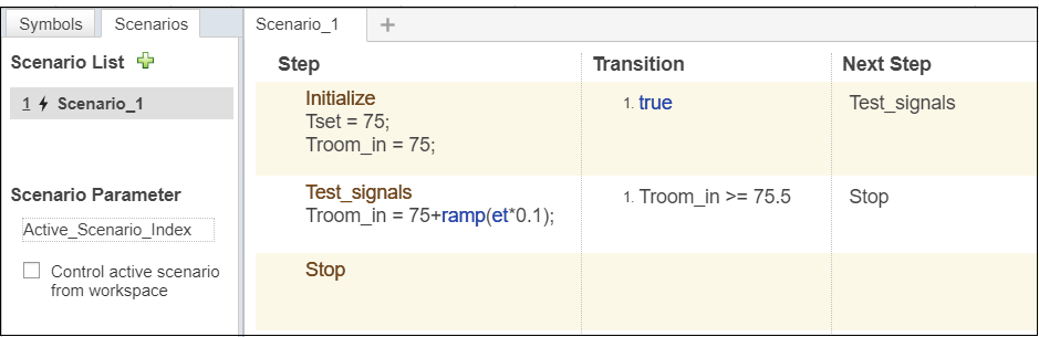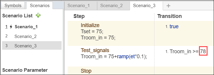 Измените Scenario_3, чтобы измениться, переход Test_signals продвигаются в Troom_in >= 78.