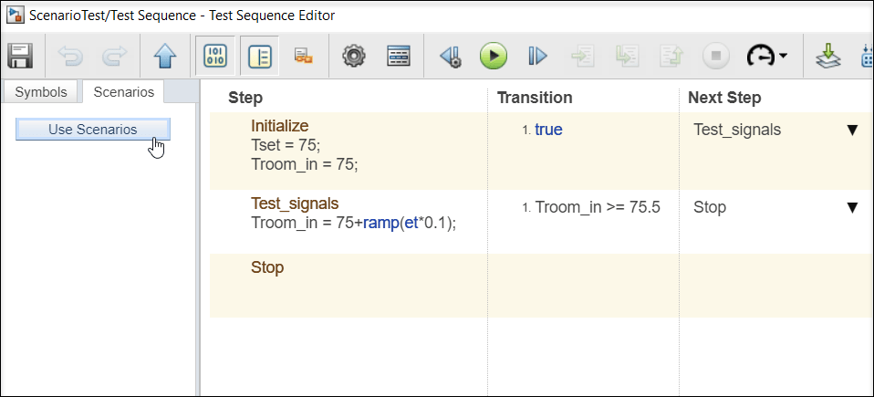 В диалоговом окне Start Using Scenarios нажмите ОК, который подтверждает, что, когда вы переключаетесь на режим сценария, вы не можете вернуться блок Test Sequence к режиму несценария. Существующие шаги и переходы перемещены во вкладку по имени Scenario_1.