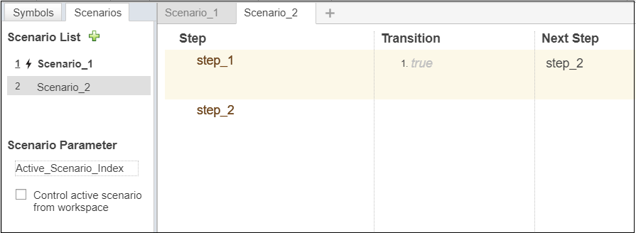 Вместо того, чтобы установить активный сценарий из Тестового Редактора Последовательности, можно использовать переменную в базовом рабочем пространстве, рабочем пространстве модели или словаре данных, чтобы управлять активным сценарием. Чтобы активировать сценарий, установите значение переменных в индекс сценария.