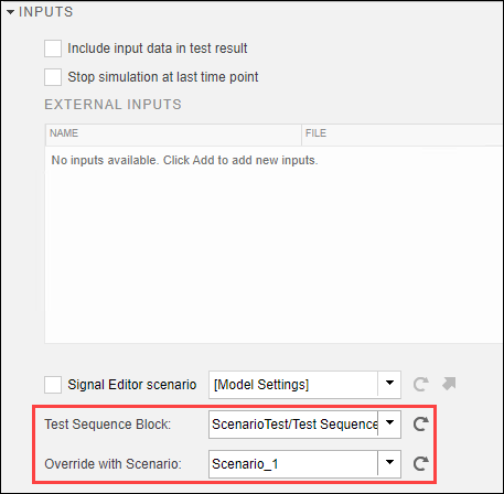 3. В разделе Inputs кликните по Значку обновления рядом с полем Test Sequence Block, чтобы заполнить его с путями, чтобы Протестировать блоки Последовательности в обвязке.