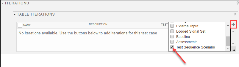 7. В разделе Iterations расширьте Табличные Итерации, кликните по знаку "плюс" в верхнем правом углу таблицы и выберите Test Sequence Scenario, чтобы добавить что столбец в таблицу.