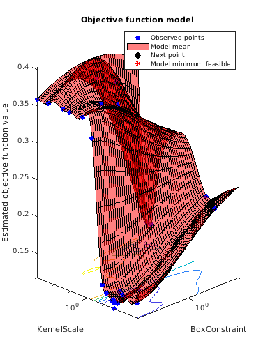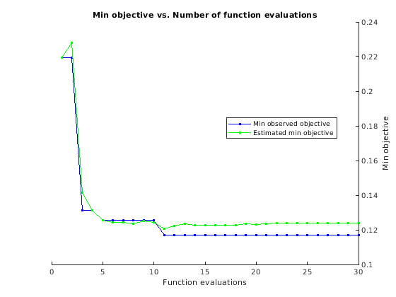 |=====================================================================================================| | Iter | Eval | Objective | Objective | BestSoFar | BestSoFar | BoxConstraint| KernelScale | | | result | | runtime | (observed) | (estim.) | | | |=====================================================================================================| | 1 | Best | 0.21937 | 15.886 | 0.21937 | 0.21937 | 64.836 | 0.0015729 | | 2 | Accept | 0.35897 | 0.12347 | 0.21937 | 0.22807 | 0.036335 | 5.5755 | | 3 | Best | 0.13105 | 6.5879 | 0.13105 | 0.14149 | 0.0022147 | 0.0023957 | | 4 | Accept | 0.35897 | 0.12384 | 0.13105 | 0.13108 | 5.1259 | 98.62 | | 5 | Best | 0.12536 | 0.15415 | 0.12536 | 0.12538 | 0.0010294 | 0.037239 | | 6 | Accept | 0.12536 | 0.16645 | 0.12536 | 0.12438 | 0.0010315 | 0.015779 | | 7 | Accept | 0.13105 | 0.97638 | 0.12536 | 0.12423 | 0.025736 | 0.022239 | | 8 | Accept | 0.21083 | 16.622 | 0.12536 | 0.12335 | 925.73 | 0.075659 | | 9 | Accept | 0.12536 | 0.15273 | 0.12536 | 0.1251 | 0.0010018 | 0.019314 | | 10 | Accept | 0.1396 | 0.25382 | 0.12536 | 0.12441 | 0.001062 | 0.0084719 | | 11 | Best | 0.11681 | 0.16627 | 0.11681 | 0.12048 | 0.001015 | 0.025891 | | 12 | Accept | 0.12536 | 0.16888 | 0.11681 | 0.12209 | 0.001004 | 0.027453 | | 13 | Accept | 0.12821 | 0.12926 | 0.11681 | 0.12344 | 0.0010094 | 0.028817 | | 14 | Accept | 0.33618 | 0.13133 | 0.11681 | 0.12271 | 0.0010009 | 0.51387 | | 15 | Accept | 0.35897 | 0.10759 | 0.11681 | 0.12274 | 2.252 | 631.08 | | 16 | Accept | 0.35897 | 0.099959 | 0.11681 | 0.12274 | 0.0010846 | 30.355 | | 17 | Accept | 0.35897 | 0.099714 | 0.11681 | 0.12273 | 0.0010073 | 214.99 | | 18 | Accept | 0.35897 | 0.096005 | 0.11681 | 0.12273 | 0.0010147 | 997.96 | | 19 | Accept | 0.14245 | 0.10556 | 0.11681 | 0.12347 | 0.0010042 | 0.13018 | | 20 | Accept | 0.1339 | 0.12193 | 0.11681 | 0.12308 | 0.0010072 | 0.071288 | |=====================================================================================================| | Iter | Eval | Objective | Objective | BestSoFar | BestSoFar | BoxConstraint| KernelScale | | | result | | runtime | (observed) | (estim.) | | | |=====================================================================================================| | 21 | Accept | 0.12536 | 0.15268 | 0.11681 | 0.12354 | 0.0010259 | 0.022573 | | 22 | Accept | 0.12536 | 0.15333 | 0.11681 | 0.12378 | 0.0010247 | 0.021897 | | 23 | Accept | 0.33903 | 0.10192 | 0.11681 | 0.12377 | 1.2002 | 17.967 | | 24 | Accept | 0.35897 | 0.12071 | 0.11681 | 0.12379 | 0.0010021 | 1.8669 | | 25 | Accept | 0.35897 | 0.1189 | 0.11681 | 0.12377 | 0.0010005 | 11.471 | | 26 | Accept | 0.35897 | 0.10255 | 0.11681 | 0.12375 | 894.24 | 999.76 | | 27 | Accept | 0.14245 | 0.10639 | 0.11681 | 0.12384 | 997.61 | 272.78 | | 28 | Accept | 0.14245 | 0.10966 | 0.11681 | 0.12384 | 999.84 | 146.94 | | 29 | Accept | 0.12821 | 0.12809 | 0.11681 | 0.12384 | 0.0073473 | 0.086267 | | 30 | Accept | 0.12251 | 0.16313 | 0.11681 | 0.12386 | 0.0070132 | 0.04651 |