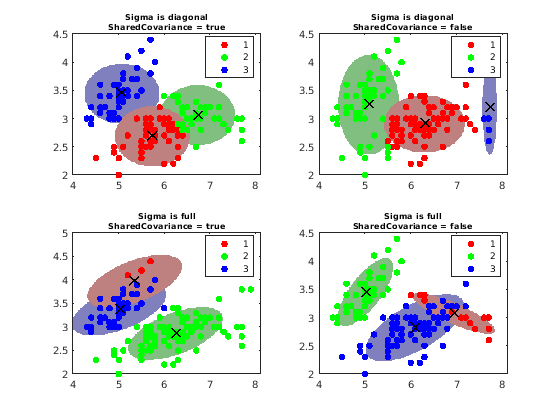 Figure contains 4 axes objects. Axes object 1 with title Sigma is diagonal SharedCovariance = true contains 7 objects of type line. These objects represent 1, 2, 3. Axes object 2 with title Sigma is diagonal SharedCovariance = false contains 7 objects of type line. These objects represent 1, 2, 3. Axes object 3 with title Sigma is full SharedCovariance = true contains 7 objects of type line. These objects represent 1, 2, 3. Axes object 4 with title Sigma is full SharedCovariance = false contains 7 objects of type line. These objects represent 1, 2, 3.