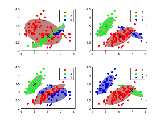 Алгоритм, который соответствует GMM к данным, может быть чувствителен к начальным условиям. Чтобы проиллюстрировать эту чувствительность, соответствуйте четырем различным GMMs можно следующим образом: