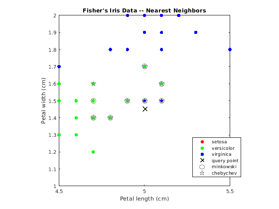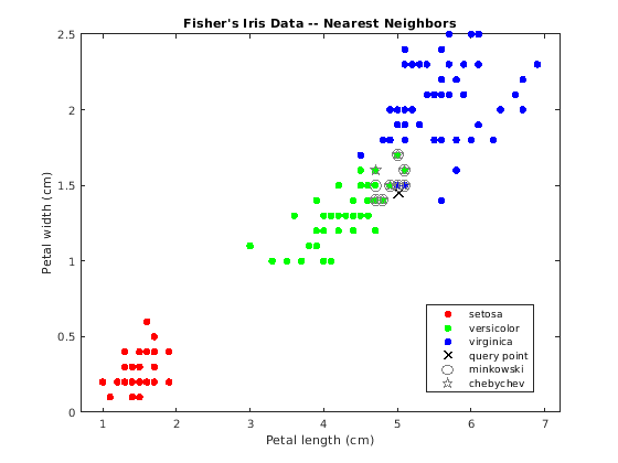 figure; gscatter(X(:,1),X(:,2),Y); title('Fisher''s Iris Data -- Nearest Neighbors'); xlabel('Petal length (cm)'); ylabel('Petal width (cm)'); hold on plot(newpoint(1),newpoint(2),'kx','MarkerSize',10,'LineWidth',2); % Query point plot(X(IdxMk,1),X(IdxMk,2),'o','Color',[.5 .5 .5],'MarkerSize',10); % Minkowski nearest neighbors plot(X(IdxCb,1),X(IdxCb,2),'p','Color',[.5 .5 .5],'MarkerSize',10); % Chebychev nearest neighbors legend('setosa','versicolor','virginica','query point',... 'minkowski','chebychev','Location','Best');