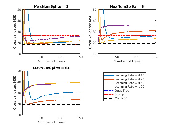 Если вы задаете Method быть повышающим алгоритмом и Learners чтобы быть деревьями решений, затем программное обеспечение выращивает stumps по умолчанию. Пень решения является одним корневым узлом, соединенным с двумя терминалами, вершинами. Можно настроить древовидную глубину путем определения MaxNumSplits, MinLeafSize, и MinParentSize использование аргументов пары "имя-значение" templateTree.