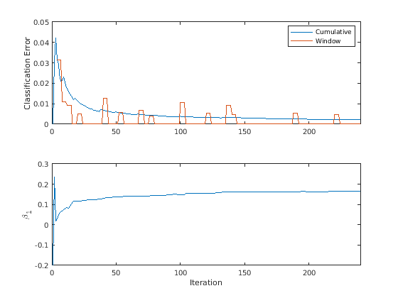 % Preallocation idxil = ~idxtt; nil = sum(idxil); numObsPerChunk = 50; nchunk = floor(nil/numObsPerChunk); ce = array2table(zeros(nchunk,2),'VariableNames',["Cumulative" "Window"]); beta1 = [IncrementalMdl.Beta(1); zeros(nchunk,1)]; Xil = X(:,idxil); Yil = Y(idxil); % Incremental fitting for j = 1:nchunk ibegin = min(nil,numObsPerChunk*(j-1) + 1); iend = min(nil,numObsPerChunk*j); idx = ibegin:iend; IncrementalMdl = updateMetrics(IncrementalMdl,Xil(:,idx),Yil(idx),... 'ObservationsIn','columns'); ce{j,:} = IncrementalMdl.Metrics{"ClassificationError",:}; IncrementalMdl = fit(IncrementalMdl,Xil(:,idx),Yil(idx),'ObservationsIn','columns'); beta1(j + 1) = IncrementalMdl.Beta(end); end