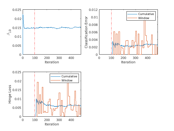 figure; subplot(2,2,1) plot(beta10) ylabel('\beta_{10}') xlim([0 nchunk]); xline(Mdl.MetricsWarmupPeriod/numObsPerChunk,'r-.'); xlabel('Iteration') subplot(2,2,2) h = plot(ce.Variables); xlim([0 nchunk]); ylabel('Classification Error') xline(Mdl.MetricsWarmupPeriod/numObsPerChunk,'r-.'); legend(h,ce.Properties.VariableNames) xlabel('Iteration') subplot(2,2,3) h = plot(hinge.Variables); xlim([0 nchunk]); ylabel('Hinge Loss') xline(Mdl.MetricsWarmupPeriod/numObsPerChunk,'r-.'); legend(h,hinge.Properties.VariableNames) xlabel('Iteration')