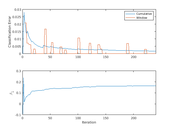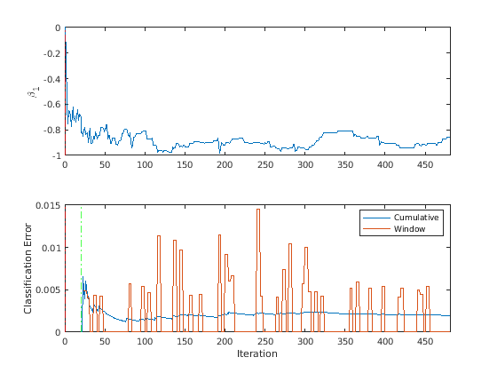 % Preallocation numObsPerChunk = 50; nchunk = floor(n/numObsPerChunk); ce = array2table(zeros(nchunk,2),'VariableNames',["Cumulative" "Window"]); hinge = array2table(zeros(nchunk,2),'VariableNames',["Cumulative" "Window"]); beta10 = zeros(nchunk,1); % Incremental fitting for j = 1:nchunk ibegin = min(n,numObsPerChunk*(j-1) + 1); iend = min(n,numObsPerChunk*j); idx = ibegin:iend; Mdl = updateMetricsAndFit(Mdl,X(idx,:),Y(idx)); ce{j,:} = Mdl.Metrics{"ClassificationError",:}; hinge{j,:} = Mdl.Metrics{"HingeLoss",:}; beta10(j + 1) = Mdl.Beta(10); end