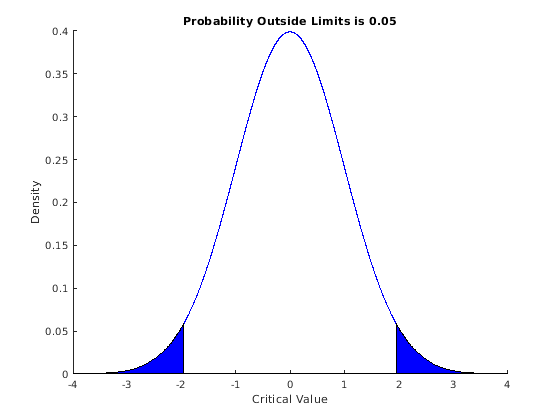 Определите критические значения на 5%-м уровне значения для тестовой статистической величины со стандартным нормальным распределением путем вычисления верхних и более низких значений на 2,5%.