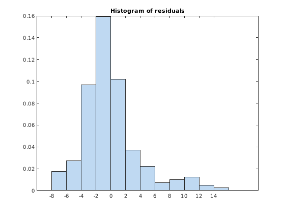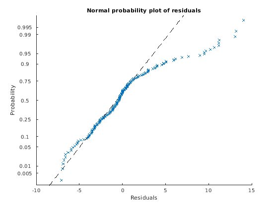 Этот график показывает тренд, который указывает на возможную корреляцию среди остаточных значений. Можно далее проверять это использование dwtest(mdl). Последовательная корреляция среди остаточных значений обычно означает, что модель может быть улучшена.