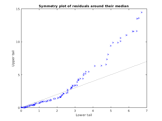Этот график также предполагает, что остаточные значения не распределяются одинаково вокруг их медианы, как ожидался бы для нормального распределения.