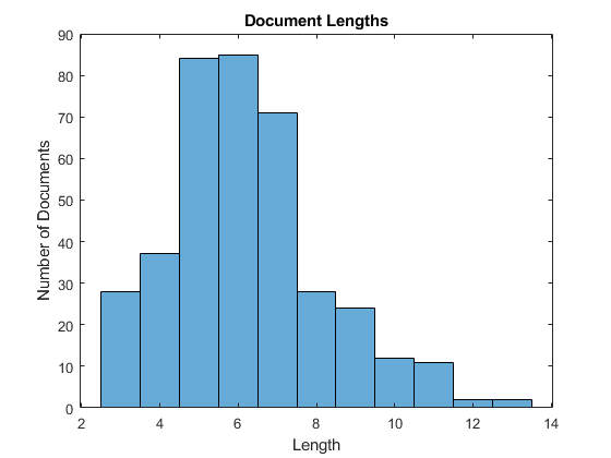 documentLengths = doclength(documentsTrain); figure histogram(documentLengths) title("Document Lengths") xlabel("Length") ylabel("Number of Documents")