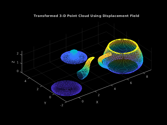 применяет поле ptCloudOut = pctransform(ptCloudIn,D)D смещения к облаку точек. Преобразование облака точек с помощью поля define смещения переводы относительно каждой точки в облаке точек.