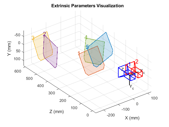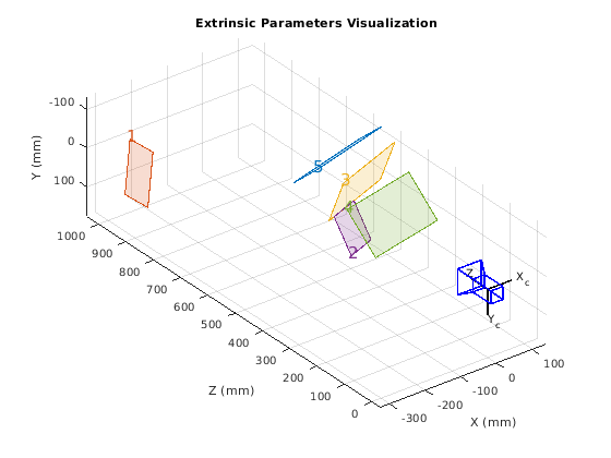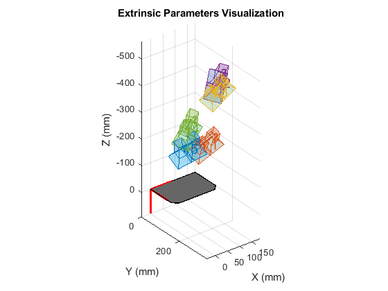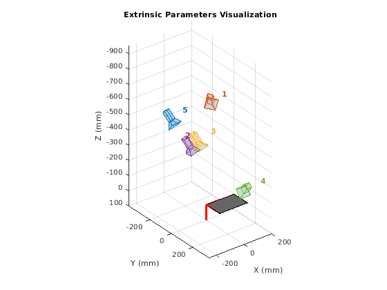showExtrinsics( представляет 3-D визуализацию внешних параметров одной калиброванной камеры или калиброванной стереопары. Графики функций 3-D представление калибровочных шаблонов относительно камеры. cameraParams)cameraParams введите содержит любого cameraParameters, fisheyeParameters, или stereoParameters объект, который estimateCameraParameters или estimateFisheyeParameters функция возвращается.