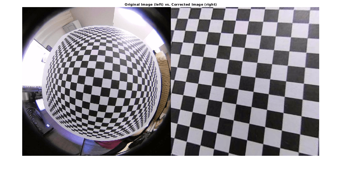 Чтобы удалить искажение объектива из изображения подозрительного взгляда, можно обнаружить калибровочный шаблон шахматной доски и затем калибровать камеру. Можно найти точки шахматной доски с помощью detectCheckerboardPoints и generateCheckerboardPoints функции. estimateFisheyeParameters функционируйте использует обнаруженные точки и возвращает fisheyeParameters объект, который содержит внутренние и внешние параметры fisheye-камеры. Можно использовать fisheyeCalibrationErrors проверять точность калибровки.