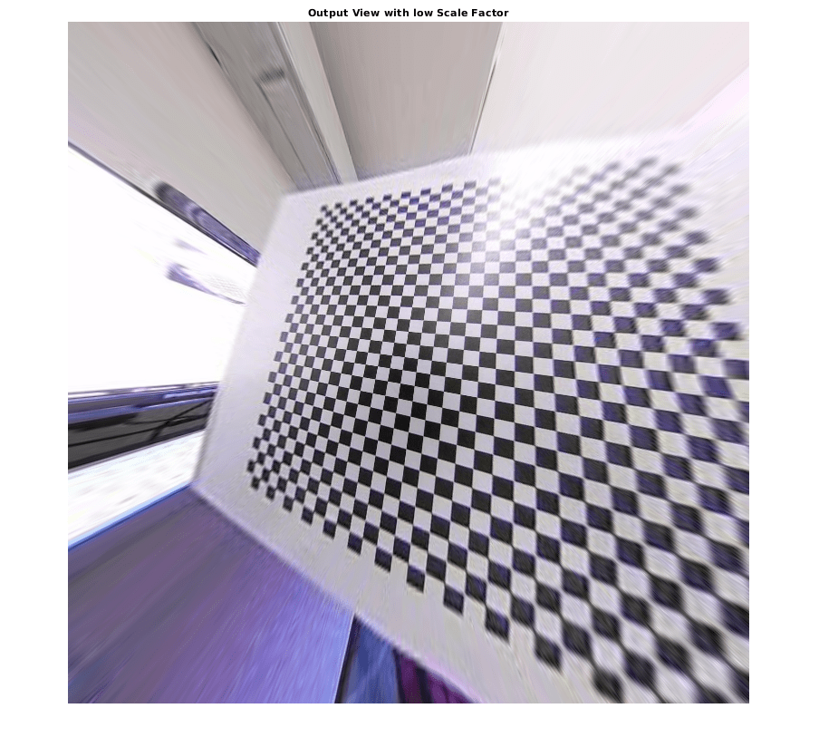 J2 = undistortFisheyeImage(I,params.Intrinsics,'OutputView','same', 'ScaleFactor', 0.2); figure imshow(J2) title('Output View with low Scale Factor')
