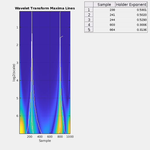 wtmm(___,'ScalingExponent','local') без выходных аргументов строит графики максимумов вейвлета в текущей фигуре. Оценки локальных экспонент Держателя отображены в таблице справа от графика.
