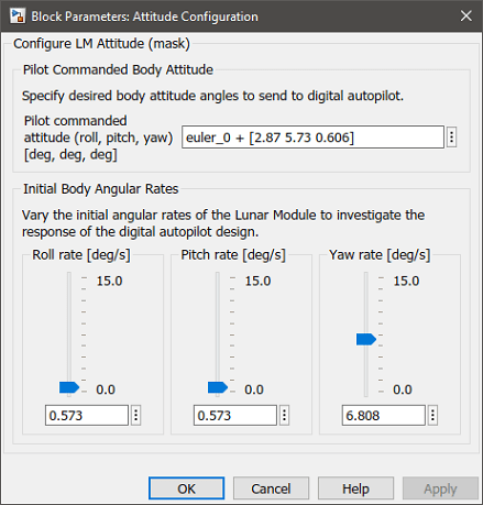 Чтобы взаимодействовать с моделью Lunar Module, варьируйтесь настройки автопилота и начальные состояния Лунного модуля в Commands область. Например, чтобы наблюдать, как цифровые указатели проекта автопилота увеличили начальные уровни тела, используйте компоненты ползунка в Configure LM Attitude подсистема.