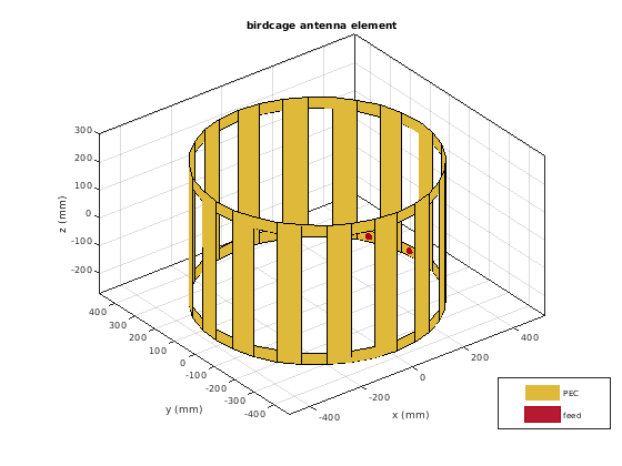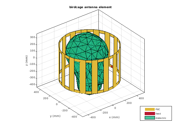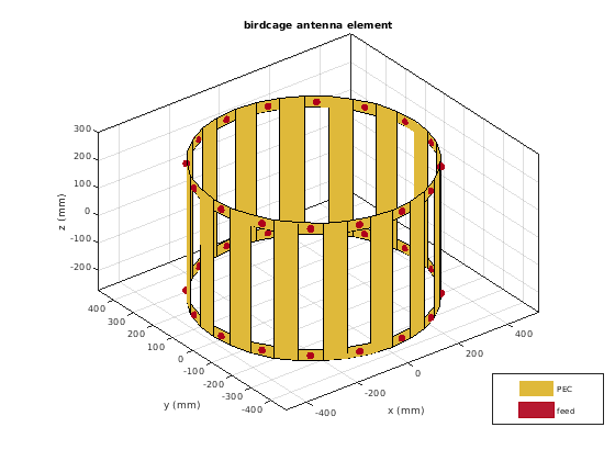 birdcage объект создает, чтобы создать птичью клетку обмотка MRI. Эта антенна обычно используется в клиническом MRI. Структура антенны состоит из двух круговых обмоток, соединенных проводящими элементами под названием rungs. Количество ступенек зависит от размера обмотки и обычно является четным числом.