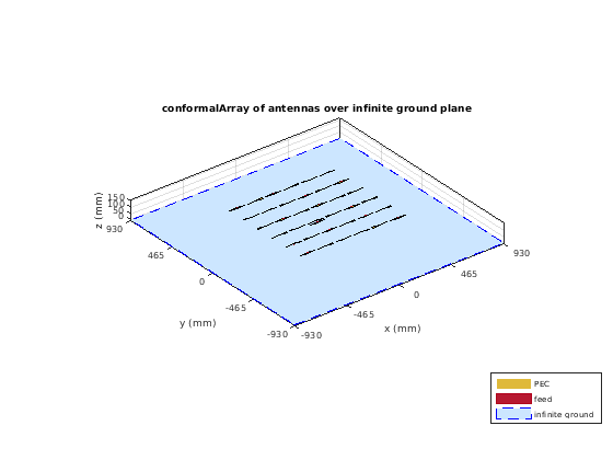 conformalArray класс создает антенную решетку с помощью любого элемента от библиотеки массивов или антенны. Можно также задать массив любой произвольной геометрии, такой как круговой массив, неплоский массив, массив с неоднородной геометрией или конформный массив массивов.