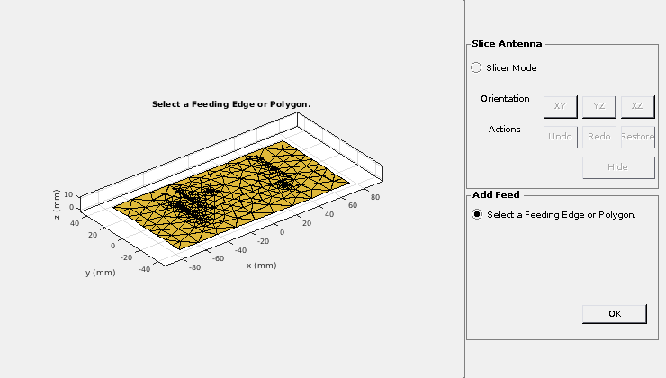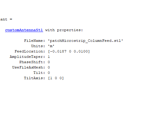 customAntennaStl объект создает 3-D геометрию антенны и mesh с помощью Стереолитографии (STL) файлы. Файлы STL используются, чтобы задать любую 3-D поверхность в форме точек и треугольников.