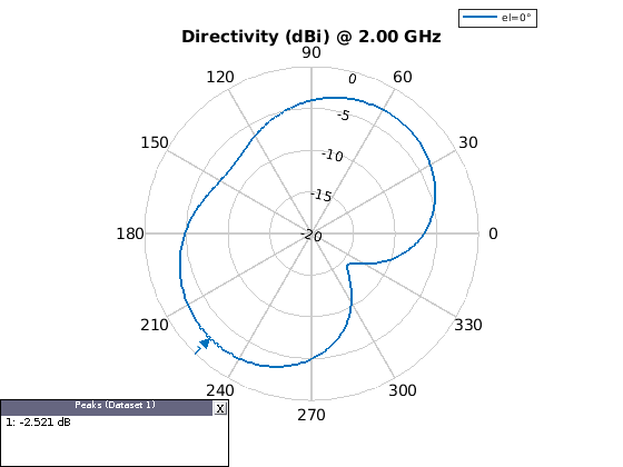 patternAzimuth(object,frequency,elevation) строит 2D диаграмму направленности антенны или объекта массивов по заданной частоте. Значения по умолчанию значений вертикального изменения, чтобы обнулить, если не заданный.