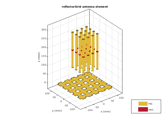 reflectorGrid объект создает сетку поддержанная отражателем антенна. Отражатель сетки использует сетку параллельных проводов или панелей, ориентированных в одном направлении. Отражатели сетки могут использоваться в качестве антенн с высоким коэффициентом усиления в коммуникациях "точка-точка".