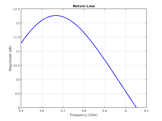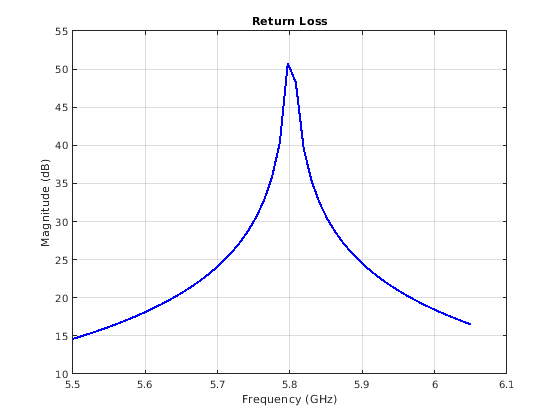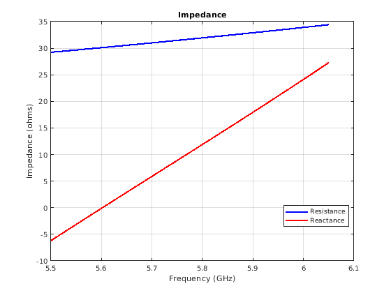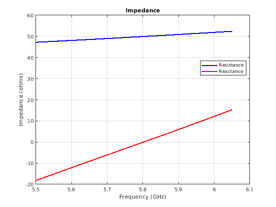 Как замечено по графику импеданса, антенна резонирует на уровне 5.6 ГГц. Сопротивление и повышение стоимости реактивного сопротивления на более высоких частотах. Импеданс на уровне 5,8 ГГц равняется 32 + j12.