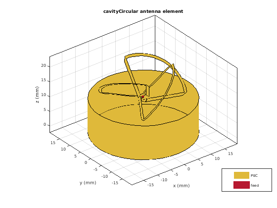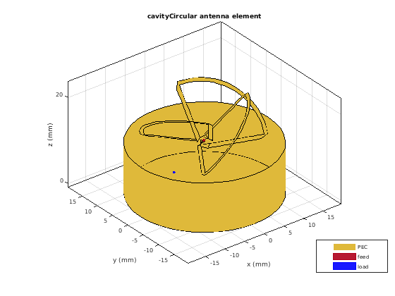 Можно также загрузить антенну в произвольном местоположении на поверхности путем определения x, y и z координат местоположения. Рассмотрите ту же трилистниковидную антенну, но поддержанный круговой полостью как показано ниже.