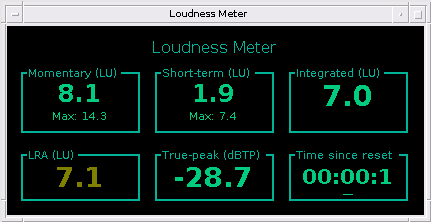 loudnessMeter Система object™ вычисляет громкость, область значений громкости и истинный пик звукового сигнала в соответствии с EBU R 128 и ITU-R стандарты BS.1770-4.