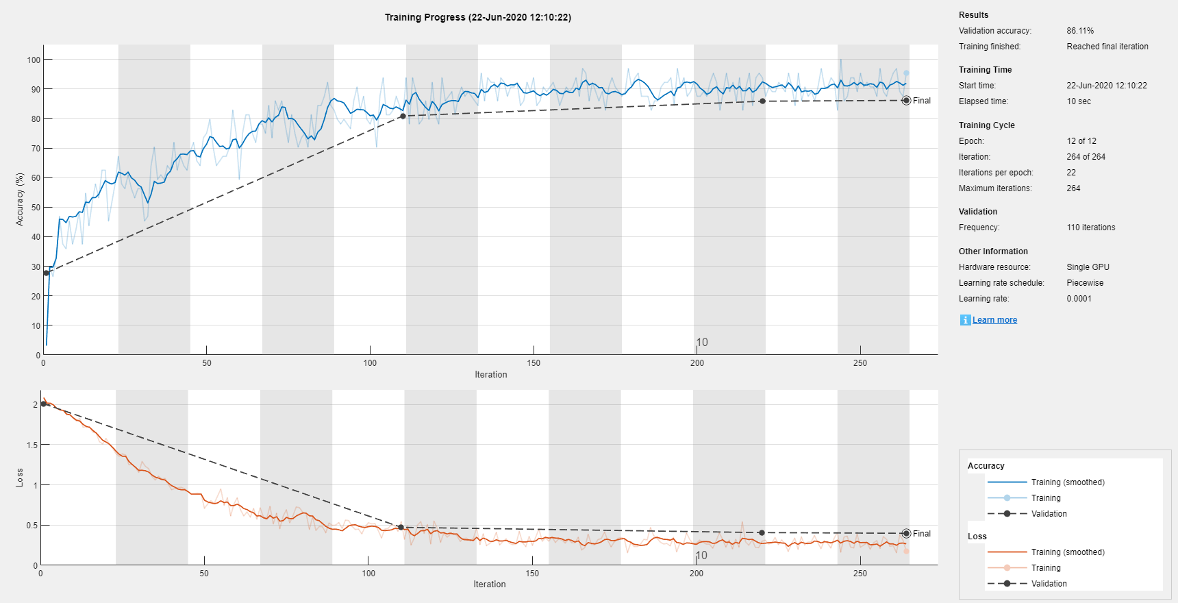 miniBatchSize = 64; validationFrequency = 5*floor(numel(trainFeatures)/miniBatchSize); options = trainingOptions("adam", ... "MaxEpochs",12, ... "MiniBatchSize",miniBatchSize, ... "Plots","training-progress", ... "Shuffle","every-epoch", ... "LearnRateSchedule","piecewise", ... "LearnRateDropPeriod",6, ... "LearnRateDropFactor",0.1, ... "ValidationData",{validationFeatures,adsValidation.Labels}, ... "ValidationFrequency",validationFrequency, ... 'Verbose',false);