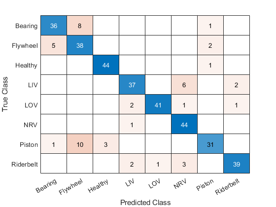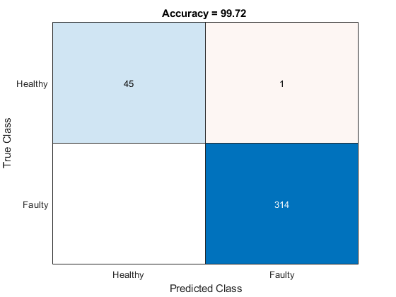 faultDetector = fitcsvm( ... trainFeatures, ... trainLabels, ... 'KernelFunction','polynomial', ... 'PolynomialOrder',3, ... 'KernelScale','auto', ... 'BoxConstraint',1, ... 'Standardize',true, ... 'ClassNames',categories(trainLabels));