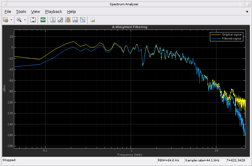 создает Системный объект, weightFilt = weightingFilterweightFilt, это выполняет взвешенную частотой фильтрацию независимо через каждый входной канал.