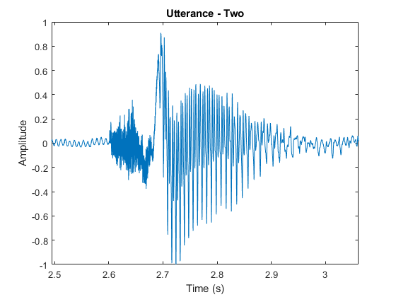 [audioIn, fs] = audioread('Counting-16-44p1-mono-15secs.wav'); twoStart = 110e3; twoStop = 135e3; audioIn = audioIn(twoStart:twoStop); timeVector = linspace((twoStart/fs),(twoStop/fs),numel(audioIn)); sound(audioIn,fs) figure plot(timeVector,audioIn) axis([(twoStart/fs) (twoStop/fs) -1 1]) ylabel('Amplitude') xlabel('Time (s)') title('Utterance - Two')