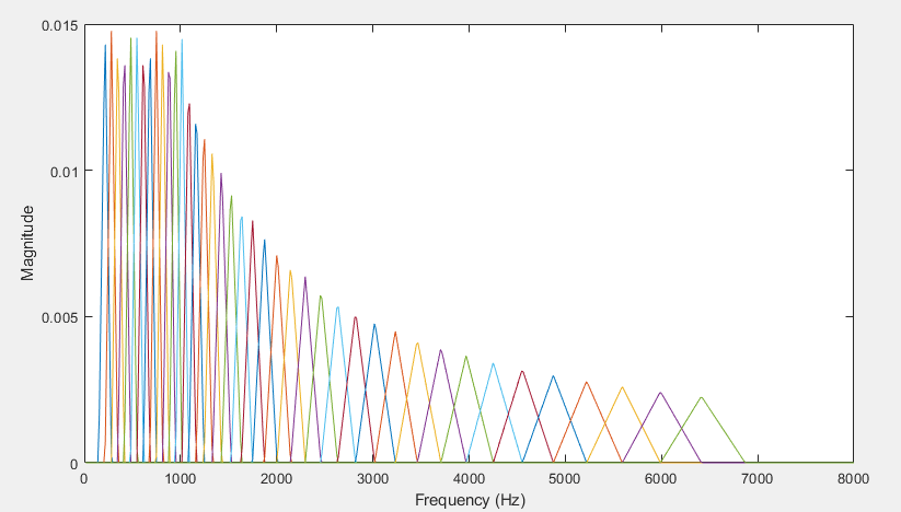 mel filterbank линейно располагает первые 10 треугольных фильтров с интервалами и логарифмически располагает остающиеся фильтры с интервалами. Отдельные полосы взвешиваются для даже энергии. График представляет типичный mel filterbank.