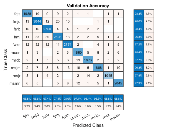 validationPredictions = kfoldPredict(partitionedModel); figure cm = confusionchart(labels,validationPredictions,'title','Validation Accuracy'); cm.ColumnSummary = 'column-normalized'; cm.RowSummary = 'row-normalized';