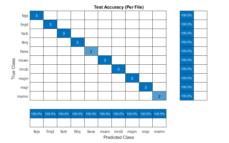 r2 = prediction(1:numel(adsTest.Files)); idx = 1; for ii = 1:numel(adsTest.Files) r2(ii) = mode(prediction(idx:idx+numVectorsPerFile(ii)-1)); idx = idx + numVectorsPerFile(ii); end figure('Units','normalized','Position',[0.4 0.4 0.4 0.4]) cm = confusionchart(adsTest.Labels,r2,'title','Test Accuracy (Per File)'); cm.ColumnSummary = 'column-normalized'; cm.RowSummary = 'row-normalized';